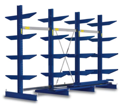 Die wichtigsten MaĂe des Kragarmregals auf einen Blick:Nutzung beidseitig - flexible Aufstellung frei im Raum möglich. 5 Lagerebenen. 4 Ebene(n) mit Kragarm, Traglast je Ebene 880 kg. Gleich lange Arme, gerade ausgerichtet. Nutztiefe 400 mm. Konstruktion aus Stahl. StĂ€nder sandgestrahlt mit Pulverbeschichtung in RAL5010 Enzianblau. Kragarme sandgestrahlt mit Pulverbeschichtung in RAL5010 Enzianblau.