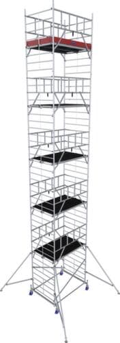Rutschhemmend profilierte Sprossen ermöglichen einen sicheren Innenaufstieg. Bühne mit wetterfestem und rutschhemmenden Belag. Sichere Anwendung durch GuardMatic-System. Durch die Befestigung des Geländerrahmens GuardMatic vor dem Einhängen der nächsthöheren Bühne ist der sichere Aufbau gewährleistet. Außerdem ist dadurch beim Durchsteigen ein komplettes Geländer und somit eine Absturzsicherung vorhanden. 4 Ausleger sorgen für zusätzliche Standsicherheit. Mit 4 gebremsten, höhenverstellbaren Fahrrollen zum Ausgleich von Bodenunebenheiten. Gerüst aus Aluminium. Belastbar bis 200 kg/m².