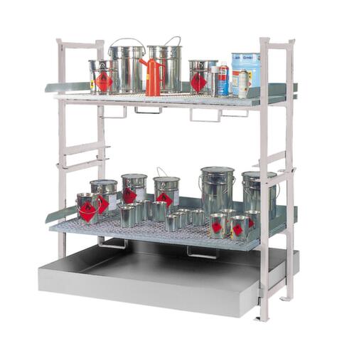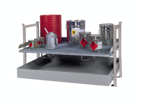 "longDescription": "<h2>Abfüllregal und Stapelgestell</h2><strong>sofort einsatzfähige Angebote</strong><br><ul><li>Geeignet für wassergefährdende und brennbare Stoffe</li><li><strong>Korrosionsgeschützt und stabil</strong> - Gestell aus verzinktem Stahl</li><li><strong>Einfacher Transport</strong> - ab 1390 mm Breite mit Staplereinfahrtaschen</li></ul><br><strong>Sie haben die Wahl:</strong><br><ul><li><strong>Praktische Komplett-Angebote oder individuelle Einzel-Angebote</strong> - mit fest aufgeschweißten Fassauflagen oder Gitterrostböden</li><li><strong>Passende Wannen</strong> - wahlweise als Einschub-, Stand- oder Kombi-Standwanne</li></ul><br><strong>Standwanne</strong><br><ul><li><strong>Volles Auffangvolumen nutzbar</strong> - mit herausnehmbarem und feuerverzinktem Gitterrost</li><li><strong>Sicherer Stand</strong> - Gitterrost mit Kantung, auf der das Stapelregal aufgeschraubt wird</li><li><strong>Für den Staplertransport geeignet</strong> durch praktische Unterfahrhöhe</li></ul><br><strong>Bestimmungen!</strong><br><br>Bauweise der Wannen behördlich zugelassen. Einsatz für gewässergefährdende, entzündbare (Flammpunkt > 55°C) und aggressive Stoffe zur Lagerung unter Dach.<br>",