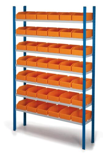 Die wichtigsten Maße des Behälterregals auf einen Blick:Übersichtliche Kleinteilelagerung auf 7 Ebenen mit Gitterboden und 50 Kästen. faltbar und beständig gegen Wasser, Schmiermittel und Chemikalien. Fachhöhen je nach Einsatzzweck und Ihrem Bedarf im Raster von 40 mm verstellbar. Nutzung einseitig - zur Aufstellung an der Wand konzipiert. Konstruktion aus Stahl. Ständer mit langlebiger und beständiger Epoxylackierung in blau. Ebenen mit langlebiger und beständiger Epoxylackierung in grau.