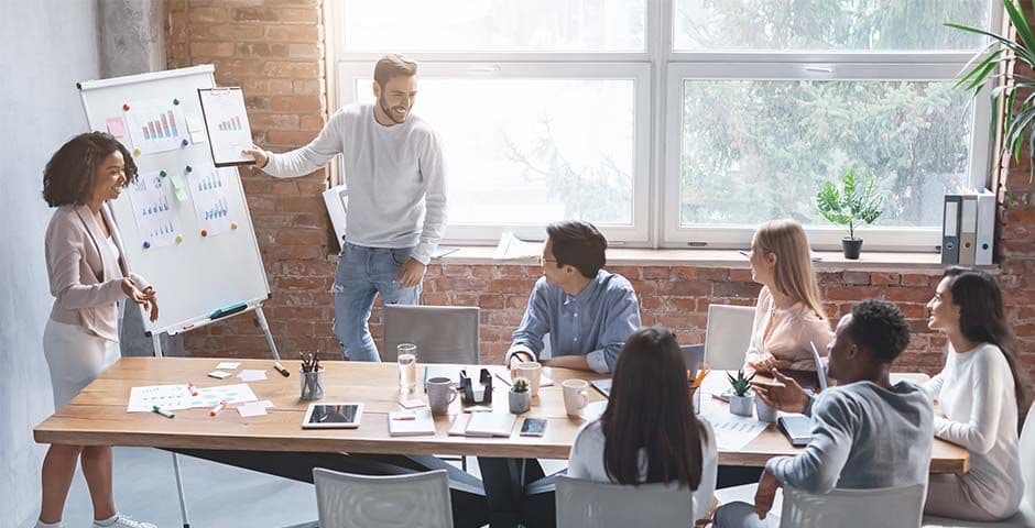 Ein weiterer zu beachtender Punkt ist der Blickkontakt. Durch Blickkontakt können Sie Ihr Publikum aktivieren aufmerksam Ihren Worten zuzuhören. Falls Sie sich eher unsicher fühlen vor einer Gruppe zu sprechen, ist es ratsam, sich abwechselnd auf jeweils eine Person zu konzentrieren.
