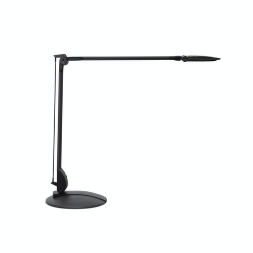 Kopf und Arm dreh- und neigbar, Armlänge 425 mm, 2-teilig. Ausgestattet mit Drehrad zum dimmen, das seitlich am unteren Gelenk integriert ist. Aufstellung mit Standfuß, Fuß Ø 220 mm. Aus Aluminium in anthrazit.