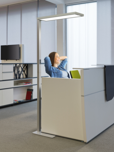 Leuchtenkopf mit Diffusor für geringen Schattenwurf. Ausgestattet mit Ein-/Aus-Schalter, Kabel mit Stecker. Höhe 1960 mm, Leuchtenkopf Länge x Breite 792 x 240 mm, Standfuß Länge x Breite 455 x 270 mm, mit Ausschnitt für Tischbein. Aus Aluminium in silber. Kabel 2,5 m lang.