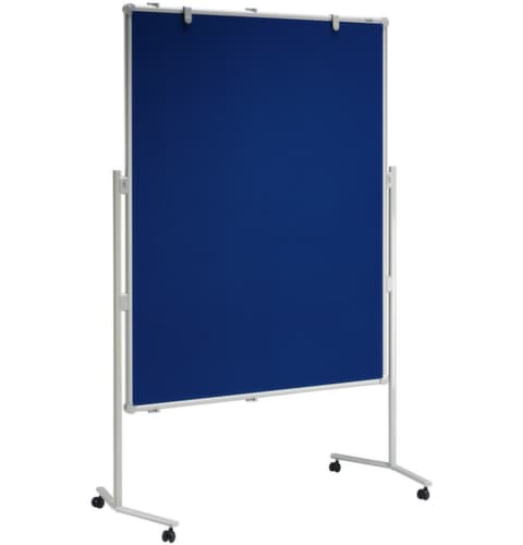 Tafel aus Textil in blau. Moderationskarten, Zeichnungen oder Bilder werden ganz einfach mit Pinnadeln angesteckt. Auch als Stellwandsystem in gerader oder gebogener Reihe nutzbar. Ausstattung: 360 Moderationskarten, 200 Pinn-Nadeln, Flipchartblock-Halter und Ablageschale. Rahmen aus Aluminium. Gestell aus Stahl in RAL7035 Lichtgrau.