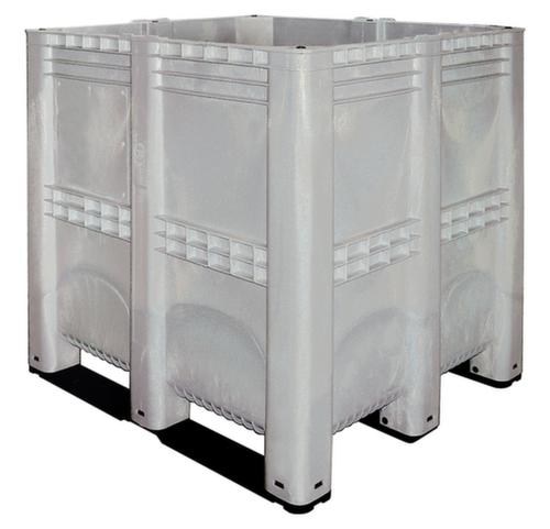 Die wichtigsten Maße des Megabehälters auf einen Blick:Aus schlagfestem Polyethylen in grau. Das Lagergut lässt sich durch die geschlossenen Wände vor Staub geschützt lagern und der Behälter lässt sich leicht reinigen, mit Verstärkungsrippen. Zur einfachen Reinigung ist der Boden geschlossen. Für das einfache Versetzen und Einfahren mit einem Stapler sorgen die Kufen. 7-fach stapelbar. Um den Behälter, auch gefüllt, versetzen zu können, ist er mit Hubgeräten unterfahr- und transportierbar. Mit einem Stapler kann man ihn zur erleichterten Entleerung kippen. Lebensmittelgeeignet. Temperaturbeständig von -40 °C bis +60 °C.