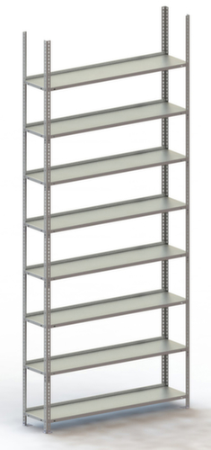 Die wichtigsten Maße des META Aktenregals auf einen Blick:Auf 8 Ebene(n) mit Böden aus Qualitätsstahlblech / 8 Ordnerhöhen könne Sie Akten, Ordner und sonstiges Büromaterial optimal organisieren. Fachhöhen je nach Einsatzzweck und Ihrem Bedarf im Raster von 25 mm verstellbar. Ebenen mit hinterer Anschlagkante gegen das Herausfallen von Ordnern. M-förmige Längskanäle mit 5-facher Abkantung sorgen für eine hohe Stabitlität und Sicherheit gegen Verletzungen. Nutzung einseitig - zur Aufstellung an der Wand konzipiert. Konstruktion aus Stahl, Ständer verzinkt mit schlag- und kratzfester Pulverbeschichtung in RAL7035 Lichtgrau, Ebenen verzinkt mit schlag- und kratzfester Pulverbeschichtung in RAL7035 Lichtgrau.