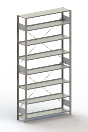 Die wichtigsten Maße des META Steckregals auf einen Blick:Auf 8 Ebene(n) mit Stahlboden / 7 Ordnerhöhen könne Sie Akten, Ordner und sonstiges Büromaterial optimal organisieren. Ebenen mit hinterer Anschlagkante gegen das Herausfallen von Ordnern. Fachhöhen je nach Einsatzzweck und Ihrem Bedarf im Raster von 25 mm verstellbar. M-förmige Längskanäle mit 5-facher Abkantung sorgen für eine hohe Stabitlität und Sicherheit gegen Verletzungen. Nutzung einseitig - zur Aufstellung an der Wand konzipiert. Hohe Stabilität in Längsrichtung durch Diagonalverstrebungen. Konstruktion aus Stahl. Ständer verzinkt mit schlag- und kratzfester Pulverbeschichtung in RAL7035 Lichtgrau. Ebenen verzinkt mit schlag- und kratzfester Pulverbeschichtung in RAL7035 Lichtgrau.