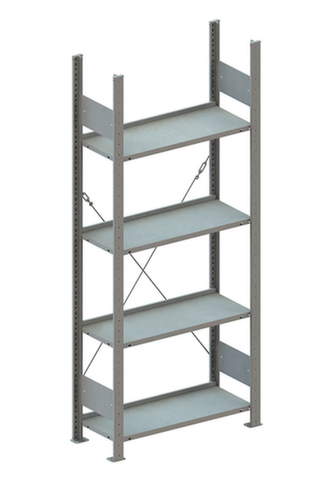 Für Ihre Sicherheit: nach DIN EN 15635 müssen Fachbodenregale ab einer 4-fachen Höhe zur Regaltiefe (Verhältnis 4:1) am Boden befestigt und gesichert werden. Die angegebenen Fachlasten gelten bei gleichmäßiger Lastverteilung. Zusätzliche Böden/Ebenen sind als Zubehör erhältlich und bis zur max. Feldlast erweiterbar.