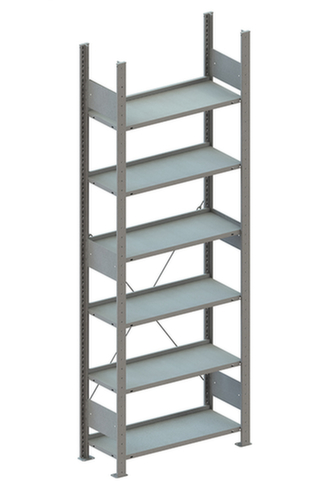 Für Ihre Sicherheit: nach DIN EN 15635 müssen Fachbodenregale ab einer 4-fachen Höhe zur Regaltiefe (Verhältnis 4:1) am Boden befestigt und gesichert werden. Die angegebenen Fachlasten gelten bei gleichmäßiger Lastverteilung. Zusätzliche Böden/Ebenen sind als Zubehör erhältlich und bis zur max. Feldlast erweiterbar.