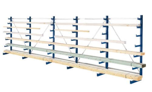 Die wichtigsten Maße des META Kragarmregals Atlas ST auf einen Blick:Nutzung einseitig - zur Aufstellung an der Wand konzipiert. 7 Lagerebenen. 6 Ebene(n) mit Kragarm, mit Abrollsicherung. Traglast je Arm 150 kg. Verschieden lange Arme in konischer Form, gerade ausgerichtet. Nutztiefe 150 mm. Konstruktion aus Stahl. Ständer sandgestrahlt mit Pulverbeschichtung in RAL5010 Enzianblau. Kragarme sandgestrahlt mit Pulverbeschichtung in RAL5010 Enzianblau.