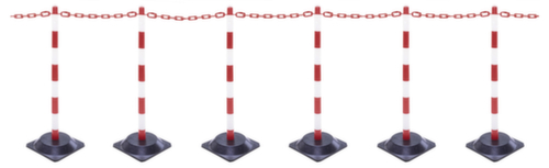 "longDescription": "<h2>Kettenständer-Set</h2><strong>mobiles Komplett-Set zum schnellen Absperren</strong><br><ul><li><strong>Set bestehend aus:</strong> 6 Kettenständern, 10 m Kette, 10 Verbindungsgliedern, 10 Einhängehaken</li><li>Mit integrierter Kettenaufnahme</li><li><strong>Leicht und unempfindlich</strong> - Pfosten aus Kunststoff</li></ul><br><strong>Sie haben die Wahl:</strong><br><ul><li><strong>Für jeden Zweck den richtigen Fuß</strong> - dreieckig aus Kunststoff mit Beton gefüllt, rund aus Kunststoff individuell befüllbar oder quadratisch aus Hartgummi</li></ul><br>Das Kettenständer-Set ist perfekt geeignet zum einfachen und schnellen mobilen Absperren. Mit den im Lieferumfang enthaltenen 6 Kettenständern, 10 m Kette, 10 Verbindungsgliedern und 10 Einhängehaken kann jeder beliebige Bereich abgesperrt werden. Durch die Höhe von 870 mm ist die Absperrung für Autofahrer und Fußgänger immer gut sichtbar. <br><br>Die Pfosten aus Kunststoff haben einem Durchmesser von 40 mm und sind in den Farbkombinationen rot/weiß oder gelb/schwarz erhältlich, wodurch eine zusätzliche Signalwirkung entsteht. Außerdem verfügen die Kettenständer über eine integrierte Kettenaufnahme. Die Ständer sind maximal im Abstand von 2 m zu stellen. Je nach Einsatzzweck können Sie zwischen verschiedenen Fußausführungen wählen.<br>",