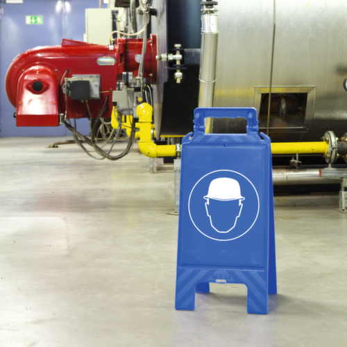 "metaDescription": "Moravia Warnaufsteller, Bodenaufsteller - Kopfschutz tragen, Bodenaufsteller, Kunststoff, blau, HxBxT 600x275x270mm",