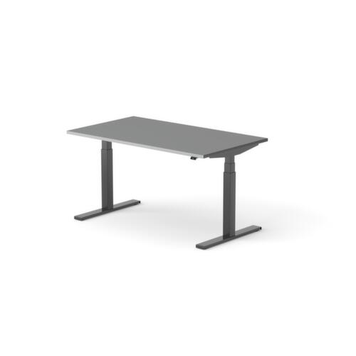 Platte aus Spanplatte mit pflegeleichter Melaminharzbeschichtung in Dekor MS Slate. Plattenform rechteckig. T-Fußgestell in RAL9005 Tiefschwarz. Höhenverstellung durch Elektromotor mit Handschalter. Mit Eurostecker.