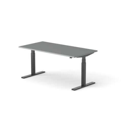 Platte aus Spanplatte mit pflegeleichter Melaminharzbeschichtung in Dekor MS Slate. Plattenform rechteckig. T-Fußgestell in RAL9005 Tiefschwarz. Höhenverstellung durch Elektromotor mit Handschalter. Mit Eurostecker.