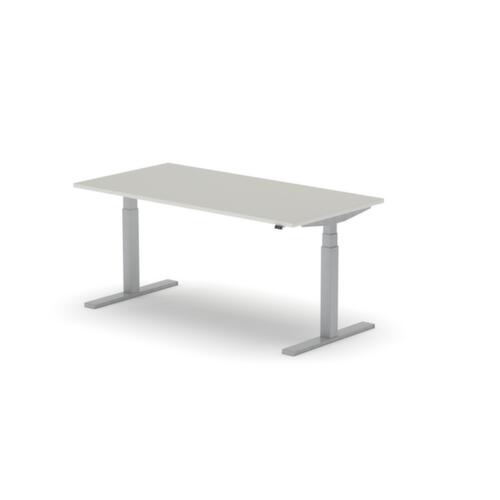 Platte aus Spanplatte mit pflegeleichter Melaminharzbeschichtung in Dekor MB White Grey. Plattenform rechteckig. T-Fußgestell in RAL9006 Weißaluminium. Höhenverstellung durch Elektromotor mit Handschalter. Mit Eurostecker.