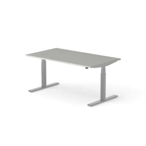 Platte aus Spanplatte mit pflegeleichter Melaminharzbeschichtung in Dekor MP Platinum. Plattenform rechteckig. T-Fußgestell in RAL9006 Weißaluminium. Höhenverstellung durch Elektromotor mit Handschalter. Mit Eurostecker.