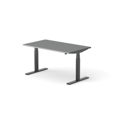Platte aus Spanplatte mit pflegeleichter Melaminharzbeschichtung in Dekor MS Slate. Plattenform rechteckig. T-Fußgestell in RAL9005 Tiefschwarz. Höhenverstellung durch Elektromotor mit Handschalter und Display. Funktionen: Abspeichern und automatisches Abrufen von programmierten Tischhöhen dank Memoryfunktion. Mit Eurostecker.