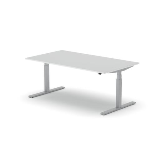 Platte aus Spanplatte mit pflegeleichter Melaminharzbeschichtung in Dekor BI White. Plattenform rechteckig. T-Fußgestell in RAL9006 Weißaluminium. Höhenverstellung durch Elektromotor mit Handschalter und Display. Funktionen: Abspeichern und automatisches Abrufen von programmierten Tischhöhen dank Memoryfunktion. Mit Eurostecker.
