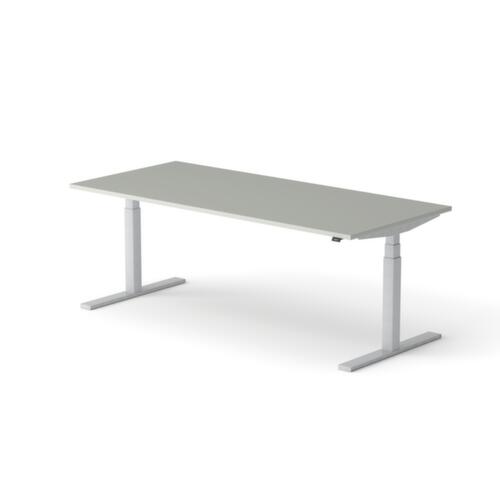 Platte aus Spanplatte mit pflegeleichter Melaminharzbeschichtung in Dekor MP Platinum. Plattenform rechteckig. T-Fußgestell in RAL9006 Weißaluminium. Höhenverstellung durch Elektromotor mit Handschalter und Display. Funktionen: Abspeichern und automatisches Abrufen von programmierten Tischhöhen dank Memoryfunktion. Mit Eurostecker.