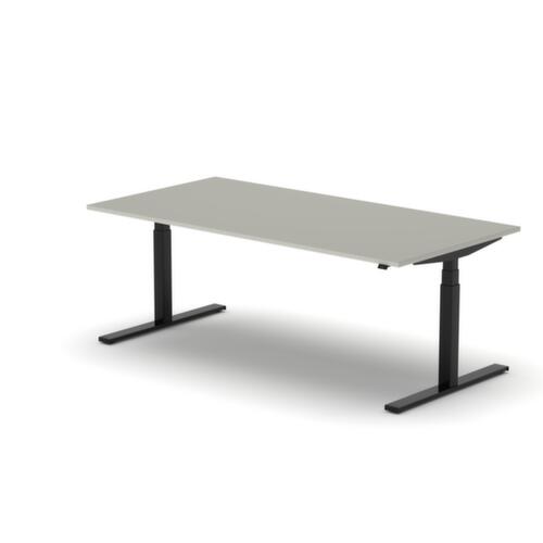 Platte aus Spanplatte mit pflegeleichter Melaminharzbeschichtung in Dekor MB White Grey. Plattenform rechteckig. T-Fußgestell in RAL9005 Tiefschwarz. Höhenverstellung durch Elektromotor mit Handschalter und Display. Funktionen: Abspeichern und automatisches Abrufen von programmierten Tischhöhen dank Memoryfunktion. Mit Eurostecker.