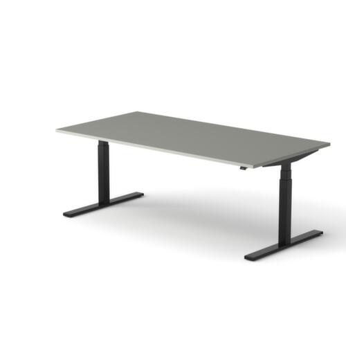 Platte aus Spanplatte mit pflegeleichter Melaminharzbeschichtung in Dekor MP Platinum. Plattenform rechteckig. T-Fußgestell in RAL9005 Tiefschwarz. Höhenverstellung durch Elektromotor mit Handschalter und Display. Funktionen: Abspeichern und automatisches Abrufen von programmierten Tischhöhen dank Memoryfunktion. Mit Eurostecker.