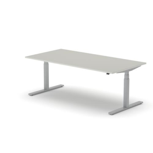 Platte aus Spanplatte mit pflegeleichter Melaminharzbeschichtung in Dekor MB White Grey. Plattenform rechteckig. T-Fußgestell in RAL9006 Weißaluminium. Höhenverstellung durch Elektromotor mit Handschalter. Mit Eurostecker.