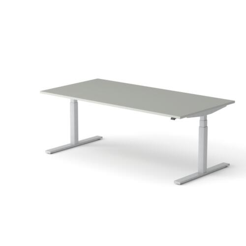 Platte aus Spanplatte mit pflegeleichter Melaminharzbeschichtung in Dekor MP Platinum. Plattenform rechteckig. T-Fußgestell in RAL9006 Weißaluminium. Höhenverstellung durch Elektromotor mit Handschalter. Mit Eurostecker.