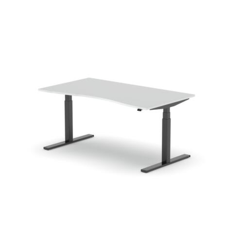 Platte aus Spanplatte mit pflegeleichter Melaminharzbeschichtung in Dekor BI White. Plattenform geschwungen. T-Fußgestell in RAL9005 Tiefschwarz. Höhenverstellung durch Elektromotor mit Handschalter. Mit Eurostecker.