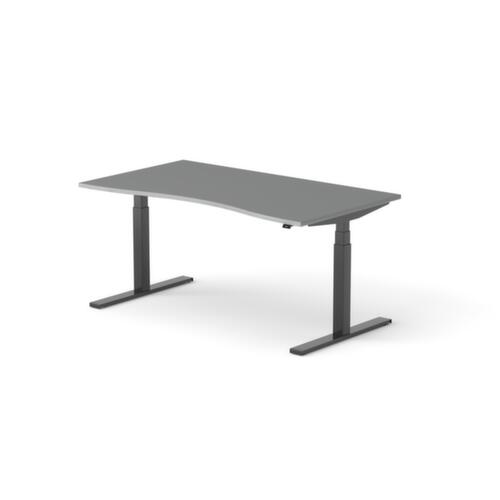 Platte aus Spanplatte mit pflegeleichter Melaminharzbeschichtung in Dekor MS Slate. Plattenform geschwungen. T-Fußgestell in RAL9005 Tiefschwarz. Höhenverstellung durch Elektromotor mit Handschalter. Mit Eurostecker.