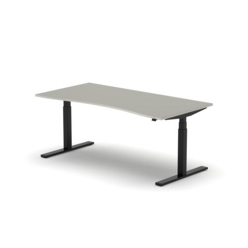 Platte aus Spanplatte mit pflegeleichter Melaminharzbeschichtung in Dekor MB White Grey. Plattenform geschwungen. T-Fußgestell in RAL9005 Tiefschwarz. Höhenverstellung durch Elektromotor mit Handschalter. Mit Eurostecker.