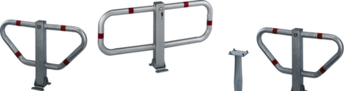 "longDescription": "<h2>Parkbügel</h2><strong>effektiver Schutz vor Fremdparkern</strong><br><ul><li><strong>Signalwirkung</strong> - mit 4 reflektierenden Streifen in rot</li><li><strong>Absolut wetterfest und langlebig</strong> - aus feuerverzinktem Stahlrohr</li></ul><br><strong>Sie haben die Wahl:</strong><br><ul><li><strong>Kein Parken zwischen den Bügeln</strong> bei extra breiter Ausführung</li><li><strong>Gesicherter Zutritt oder freier Rettungsweg</strong> - mit Zylinder- oder Dreikantschloss</li><li><strong>Schnelle oder extra standfeste Montage</strong> - zum Aufdübeln oder Einbetonieren</li></ul>",