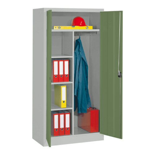 Die wichtigsten Maße des PAVOY Universalschrankes Basis auf einen Blick:Der Schrankkorpus ist aus Stahlblech gefertigt und stabil verschweißt. Das macht die Konstruktion besonders robust und widerstandsfähig und somit langlebiger. Die verschweißten Ecken und Kanten des Korpus gewährleisten eine höhere Dichtigkeit und somit eine bessere Schutzfunktion gegen Staub, Feuchtigkeit und Schmutz als eine geschraubte Konstruktion. Zudem sind keine regelmäßigen Wartungsarbeiten und Nachjustierungen nötig. Die Mitteltrennwand unterteilt den Schrank in zwei separate Bereiche, die auf verschiedene Arten und für unterschiedlich große Gegenstände genutzt werden können. Links ausgestattet mit 3 Böden, rechts mit 1 Kleiderstange mit 3 Schiebehaken. Hohe Flexibilität der Inneneinrichtung durch Verstellbarkeit der Fachhöhen im Raster von 17 mm. Ausgestattet mit Böden, Hutboden, Kleiderstange, Haken. Über die Doppelflügeltür ist der Zugriff auf den Schrankinhalt besonders komfortabel. Die innenliegenden Drehbolzen der einschlagenden Türen bieten den Vorteil einer sauberen Optik, da keine Schrauben oder Scharniere von außen sichtbar sind. Dadurch wird das Design des Schrankes nicht beeinträchtigt und das gesamte Möbelstück wirkt hochwertiger. Damit ist auch die glatte Oberfläche leichter zu reinigen, da keine Schmutz- oder Staubablagerungen an unzugänglichen Stellen zu befürchten sind. Das innenliegende Kastenprofil und die allseitige Abkantung erhöhen die Steifigkeit der Türen und macht sie widerstandsfähiger gegen Verformungen. Dadurch können sie auch stärkeren Belastungen standhalten und bieten einen hohen Diebstahlschutz. Öffnen lässt sich der Mehrzweckschrank mit Drehgriff. Verschließbar mit Zylinderschloss. Der untergebaute Sockel sorgt dafür, dass das Gewicht des Schrankes gleichmäßig auf dem Boden verteilt wird. Dies erhöht die Stabilität und der Schrank kann schwerer Lasten aufnehmen, als ein Schrank mit Füßen. Außerdem können Schmutz, Staub und Feuchtigkeit nicht unter den Schrank gelangen, was die Reinigungsfläche verkleinert.