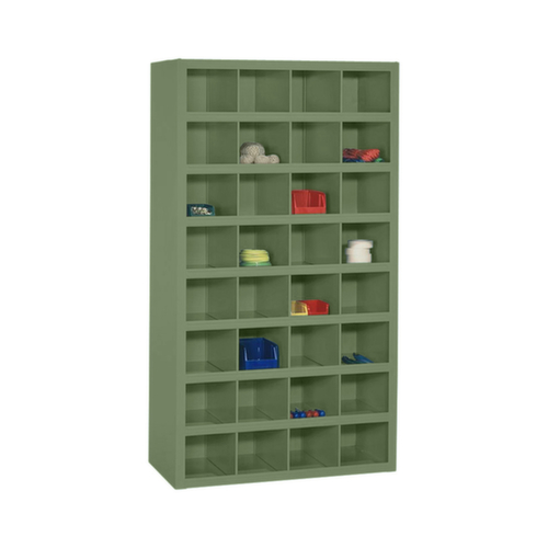32 Fächer bieten genügend Stauraum um z. B. Papiere, Verbrauchsmaterial oder Ersatzteile sortiert zu lagern. 4 Fächer pro Ebene. Fächer mit Abrollrand (40 mm) und integrierter Etikettenleiste. Konstruktion aus Stahlblech mit schlag- und kratzfester Pulverbeschichtung. Ebenen mit schlag- und kratzfester Pulverbeschichtung.