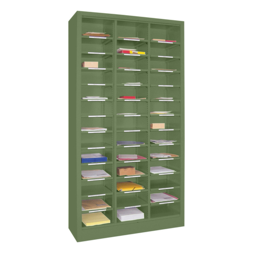 39 Fächer bieten genügend Stauraum um z. B. Papiere, Verbrauchsmaterial oder Ersatzteile sortiert zu lagern. 3 Fächer pro Ebene. Fachhöhen je nach Einsatzzweck und Ihrem Bedarf im Raster von 17 mm verstellbar. Konstruktion aus Stahl mit schlag- und kratzfester Pulverbeschichtung. Ebenen in Korpusfarbe.