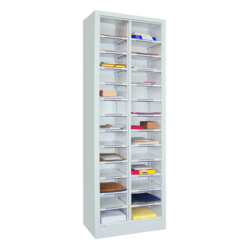 26 Fächer bieten genügend Stauraum um z. B. Papiere, Verbrauchsmaterial oder Ersatzteile sortiert zu lagern. 2 Fächer pro Ebene. Fachhöhen je nach Einsatzzweck und Ihrem Bedarf im Raster von 17 mm verstellbar. Konstruktion aus Stahl mit schlag- und kratzfester Pulverbeschichtung. Ebenen in Korpusfarbe.