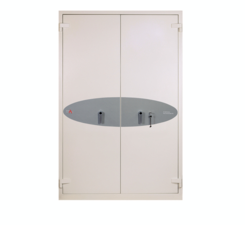 Höhenverstellbare Böden, die standardmäßig Hängeschienen für HR-Mappen enthalten. Mit Doppel-Flügeltür. Verschließbar mit Hochsicherheits-Doppelbartschloss der VdS-Klasse I. Konstruktion aus Stahl. Korpus mit Lackierung in RAL9003 Signalweiß. Front mit Lackierung in RAL9003 Signalweiß.