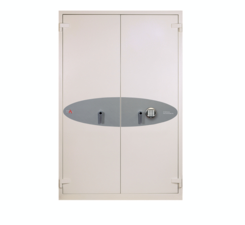 Höhenverstellbare Böden, die standardmäßig Hängeschienen für HR-Mappen enthalten. Mit Doppel-Flügeltür. Verschließbar mit elektronischem Hochsicherheitsschloss der VdS-Klasse II mit Doppelsteuerung, Mastercode und Zeitverzögerung. Konstruktion aus Stahl. Korpus mit Lackierung in RAL9003 Signalweiß. Front mit Lackierung in RAL9003 Signalweiß.