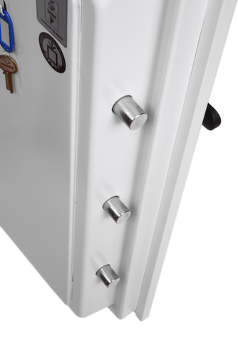 1 Schublade, 2 Ablageböden und 5 Schlüsselhaken. Mit Flügeltür. Verschließbar mit Elektronikschloss. Automatische Türverriegelung beim Schließen für sofortige Sicherheit. Konstruktion aus Stahl. Korpus mit Lackierung in RAL9003 Signalweiß. Front mit Lackierung in RAL9003 Signalweiß.