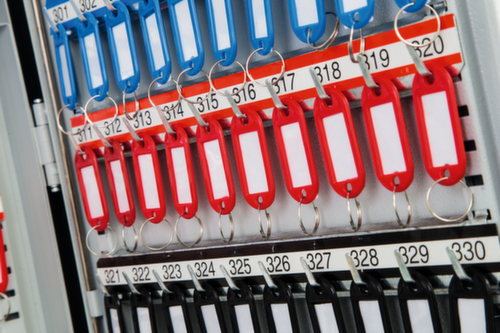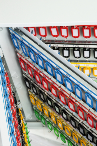 Hakenleisten verstellbar, nummeriert und in verschiedenen Farben. Die farbigen Schlüsselringe und Anhänger sorgen für einen aufgeräumten Schrankinhalt und Überblick. Staubgeschützt zu schließen über Doppel-Flügeltür. Verschließbar mit elektronischem Codeschloss, das mit einem eigenen 4-stelligen Benutzercode programmiert werden und nach Bedarf einfach geändert werden kann. Konstruktion aus Stahl. Korpus mit schlag- und kratzfester Pulverbeschichtung in grau. Front mit schlag- und kratzfester Pulverbeschichtung in grau. Vorbereitet zur Rückwandverankerung.