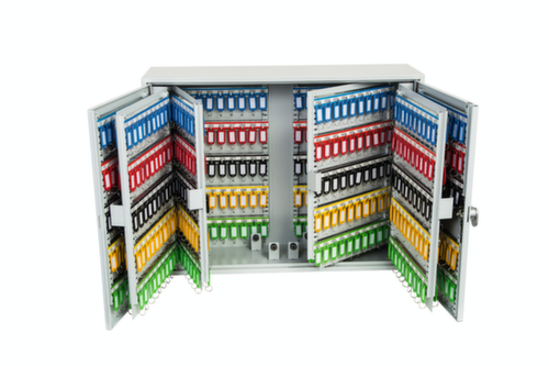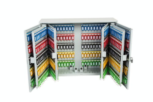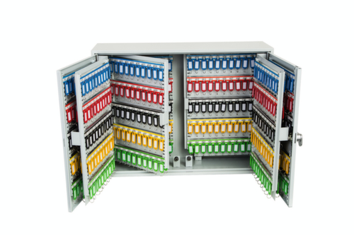 Hakenleisten verstellbar, nummeriert und in verschiedenen Farben. Die farbigen Schlüsselringe und Anhänger sorgen für einen aufgeräumten Schrankinhalt und Überblick. Staubgeschützt zu schließen über Doppel-Flügeltür. Verschließbar mit elektronischem Codeschloss, das mit einem eigenen 4-stelligen Benutzercode programmiert werden und nach Bedarf einfach geändert werden kann. Konstruktion aus Stahl. Korpus mit schlag- und kratzfester Pulverbeschichtung in grau. Front mit schlag- und kratzfester Pulverbeschichtung in grau. Vorbereitet zur Rückwandverankerung.