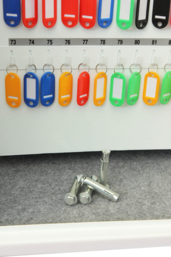 Ausgestattet mit einer Schlüsselüberbrückungseinrichtung zur Sicherheit, falls der Code verlegt wird. Die farbigen Schlüsselringe und Anhänger sorgen für einen aufgeräumten Schrankinhalt und Überblick. Flügeltür. Verschließbar mit manipulationssicherem Elektronikschloss. Konstruktion aus Stahl. Korpus mit kratzfester Beschichtung in RAL9003 Signalweiß. Front mit kratzfester Beschichtung in RAL9003 Signalweiß. Vorbereitet zur Rückwandverankerung.