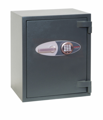 Ausstattung: Boden. Mit Flügeltür. Verschließbar mit elektronischem Hochsicherheitsschloss der VdS-Klasse II mit Doppelsteuerung, Mastercode und Zeitverzögerung. Verriegelung über 3-Wege-Winkelverriegelungsbolzen und sorgt somit für hohe Robustheit. Konstruktion aus Stahl. Korpus in RAL7024 Graphitgrau. Front in RAL7024 Graphitgrau. Vorbereitet zur Boden-/Rückwandverankerung.