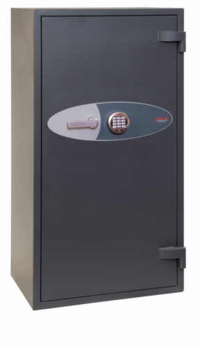 Ausstattung: Böden. Mit Flügeltür. Verschließbar mit elektronischem Hochsicherheitsschloss der VdS-Klasse II mit Doppelsteuerung, Mastercode und Zeitverzögerung. Verriegelung über 3-Wege-Winkelverriegelungsbolzen und sorgt somit für hohe Robustheit. Konstruktion aus Stahl. Korpus in RAL7024 Graphitgrau. Front in RAL7024 Graphitgrau. Vorbereitet zur Boden-/Rückwandverankerung.