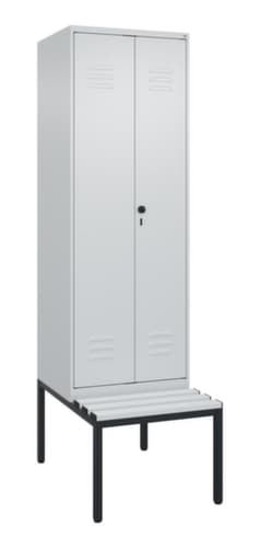 Die wichtigsten Maße des C+P Garderobenschranks Classic Plus auf einen Blick:Je Abteil 1 stabile Garderobenstange aus Ovalprofil mit 3 verdrehsicheren Doppelschiebehaken, oberhalb ein durchgehender Hutboden über je 2 Abteile. Diese extra breite Ablage bietet den idealen Stauraum für PSA-Ausrüstung wie z. B. Helme, Augen- oder Gehörschutz. Doppel-Flügeltür mit Lüftungsschlitzen und Etikettenrahmen. Die innenliegenden Drehbolzen der einschlagenden Türen bieten den Vorteil einer sauberen Optik, da keine Schrauben oder Scharniere von außen sichtbar sind. Dadurch wird das Design des Schrankes nicht beeinträchtigt und das gesamte Möbelstück wirkt hochwertiger. Damit ist auch die glatte Oberfläche leichter zu reinigen, da keine Schmutz- oder Staubablagerungen an unzugänglichen Stellen zu befürchten sind. Jede Tür ist serienmäßig mit einer Anschlagsdämpfung ausgestattet, so dass, auch durch ein schwungvolles Schließen, die Tür nicht zuknallt. Das trägt nicht nur zu einer angenehmeren Geräuschkulisse bei, sondern schont auch den Stahlschrank vor Beschädigungen. Von der Natur inspiriert schafft der BIONIC Steel Frame eine besonders effiziente und stabile Konstruktion. Durch eine raffinierte innere Struktur aus Faltungen, Streben und Zwischenräumen, sowie höhere Materialstärke an entscheidenden Stellen, wie z. B. im vorderen Bereich der Seitenwände und in den Trennwand- und Kastenprofilen, wird die Verwindungssteifigkeit zusätzlich erhöht. Verschließbar mit Sicherheits-Drehriegel für Vorhängeschloss. Das Sicherheitsschloss ist besonders aufbruchsicher, da es im verschlossenen Zustand durchdreht und erst nach Entfernung des Schlosses einrastet. Passend für alle Vorhängeschlösser mit einer Bügelstärke von 6 - 8 mm. Pro Person stehen 2 Abteile zur Verfügung, die über die zueinander schlagenden Türen gemeinsam verschließbar sind. Dadurch ist eine strikte und saubere Trennung von Arbeits- und Alltagskleidung ganz einfach möglich. Die zusätzlichen Lüftungsöffnungen im Abteil, kombiniert mit den Lüftungsschlitzen in der Tür, verbessern den Luftstrom. Dadurch wird der Schrankinhalt besser belüftet und trocknet schneller, ohne unangenehme Gerüche zu verursachen. Die untergebaute Sitzbank sorgt für eine effiziente Nutzung des verfügbaren Raumes. Sie ermöglicht ein bequemes An- und Ausziehen und bietet direkt noch Stauraum, ohne zusätzlichen Platz zu beanspruchen. Die Leisten sind aus Kunststoff. Das untergebaute Fußgestell reduziert mögliche Ansammlungen von Schmutz und Staub, da eine vollflächige Reinigung einfach möglich ist. Zudem wird zusätzlicher Stauraum unter dem Schrank geschaffen. Schuhe und Taschen stehen nicht mehr im Raum und stellen weniger Stolpergefahr dar. Konstruktion aus Stahl, stabil verschweißt. Das macht die Konstruktion besonders robust und widerstandsfähig und somit langlebiger. Die verschweißten Ecken und Kanten des Korpus gewährleisten eine höhere Dichtigkeit und somit eine bessere Schutzfunktion gegen Staub, Feuchtigkeit und Schmutz als eine geschraubte Konstruktion. Zudem sind keine regelmäßigen Wartungsarbeiten und Nachjustierungen nötig. Korpus mit Einbrennlackierung in RAL7035 Lichtgrau, Front mit Einbrennlackierung in RAL7035 Lichtgrau.