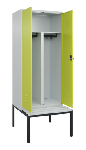 Die wichtigsten Maße des C+P Garderobenschranks Classic Plus auf einen Blick:Je Abteil 1 stabile Garderobenstange aus Ovalprofil mit 3 verdrehsicheren Doppelschiebehaken, oberhalb ein durchgehender Hutboden über je 2 Abteile. Diese extra breite Ablage bietet den idealen Stauraum für PSA-Ausrüstung wie z. B. Helme, Augen- oder Gehörschutz. Doppel-Flügeltür mit Lüftungsschlitzen und Etikettenrahmen. Die innenliegenden Drehbolzen der einschlagenden Türen bieten den Vorteil einer sauberen Optik, da keine Schrauben oder Scharniere von außen sichtbar sind. Dadurch wird das Design des Schrankes nicht beeinträchtigt und das gesamte Möbelstück wirkt hochwertiger. Damit ist auch die glatte Oberfläche leichter zu reinigen, da keine Schmutz- oder Staubablagerungen an unzugänglichen Stellen zu befürchten sind. Jede Tür ist serienmäßig mit einer Anschlagsdämpfung ausgestattet, so dass, auch durch ein schwungvolles Schließen, die Tür nicht zuknallt. Das trägt nicht nur zu einer angenehmeren Geräuschkulisse bei, sondern schont auch den Stahlschrank vor Beschädigungen. Von der Natur inspiriert schafft der BIONIC Steel Frame eine besonders effiziente und stabile Konstruktion. Durch eine raffinierte innere Struktur aus Faltungen, Streben und Zwischenräumen, sowie höhere Materialstärke an entscheidenden Stellen, wie z. B. im vorderen Bereich der Seitenwände und in den Trennwand- und Kastenprofilen, wird die Verwindungssteifigkeit zusätzlich erhöht. Verschließbar mit Sicherheits-Drehriegel für Vorhängeschloss. Das Sicherheitsschloss ist besonders aufbruchsicher, da es im verschlossenen Zustand durchdreht und erst nach Entfernung des Schlosses einrastet. Passend für alle Vorhängeschlösser mit einer Bügelstärke von 6 - 8 mm. Pro Person stehen 2 Abteile zur Verfügung, die über die zueinander schlagenden Türen gemeinsam verschließbar sind. Dadurch ist eine strikte und saubere Trennung von Arbeits- und Alltagskleidung ganz einfach möglich. Die zusätzlichen Lüftungsöffnungen im Abteil, kombiniert mit den Lüftungsschlitzen in der Tür, verbessern den Luftstrom. Dadurch wird der Schrankinhalt besser belüftet und trocknet schneller, ohne unangenehme Gerüche zu verursachen. Die untergebaute Sitzbank sorgt für eine effiziente Nutzung des verfügbaren Raumes. Sie ermöglicht ein bequemes An- und Ausziehen und bietet direkt noch Stauraum, ohne zusätzlichen Platz zu beanspruchen. Die Leisten sind aus Kunststoff. Das untergebaute Fußgestell reduziert mögliche Ansammlungen von Schmutz und Staub, da eine vollflächige Reinigung einfach möglich ist. Zudem wird zusätzlicher Stauraum unter dem Schrank geschaffen. Schuhe und Taschen stehen nicht mehr im Raum und stellen weniger Stolpergefahr dar. Konstruktion aus Stahl, stabil verschweißt. Das macht die Konstruktion besonders robust und widerstandsfähig und somit langlebiger. Die verschweißten Ecken und Kanten des Korpus gewährleisten eine höhere Dichtigkeit und somit eine bessere Schutzfunktion gegen Staub, Feuchtigkeit und Schmutz als eine geschraubte Konstruktion. Zudem sind keine regelmäßigen Wartungsarbeiten und Nachjustierungen nötig. Korpus mit Einbrennlackierung in RAL7035 Lichtgrau, Front mit Einbrennlackierung in RDS 110 80 60 Viridingrün.