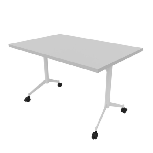 Zum Verstauen bei Nichtgebrauch kann die Tischplatte über die Griffstange um 90° gekippt werden. Plattenform eckig. T-Fußgestell aus Metall mit Epoxidpulverbeschichtung in weiß. Ovalrohr. 4 Rollen unter dem Gestell sorgen für die nötige Mobilität im Arbeitsalltag. Platte aus Holzwerkstoffplatte mit abriebfester und feuchtigkeitsbeständiger Melaminbeschichtung in Dekor grau. Plattenstärke 30 mm. Alle Kanten sind durch schlagfeste ABS-Umleimer vor unschönen Rissen und Ausbrechen geschützt. Ausgestattet mit Haken- und Verriegelungssystem zur frontalen und seitlichen Verbindung von Tischplatten.