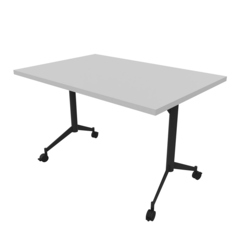 Zum Verstauen bei Nichtgebrauch kann die Tischplatte über die Griffstange um 90° gekippt werden. Plattenform eckig. T-Fußgestell aus Metall mit Epoxidpulverbeschichtung in dunkelgrau. Ovalrohr. 4 Rollen unter dem Gestell sorgen für die nötige Mobilität im Arbeitsalltag. Platte aus Holzwerkstoffplatte mit abriebfester und feuchtigkeitsbeständiger Melaminbeschichtung in Dekor grau. Plattenstärke 30 mm. Alle Kanten sind durch schlagfeste ABS-Umleimer vor unschönen Rissen und Ausbrechen geschützt. Ausgestattet mit Haken- und Verriegelungssystem zur frontalen und seitlichen Verbindung von Tischplatten.