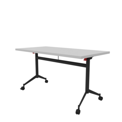 Zum Verstauen bei Nichtgebrauch kann die Tischplatte über die Griffstange um 90° gekippt werden. Plattenform eckig. T-Fußgestell aus Metall mit Epoxidpulverbeschichtung in dunkelgrau. Ovalrohr. 4 Rollen unter dem Gestell sorgen für die nötige Mobilität im Arbeitsalltag. Platte aus Holzwerkstoffplatte mit abriebfester und feuchtigkeitsbeständiger Melaminbeschichtung in Dekor grau. Plattenstärke 30 mm. Alle Kanten sind durch schlagfeste ABS-Umleimer vor unschönen Rissen und Ausbrechen geschützt. Ausgestattet mit Haken- und Verriegelungssystem zur frontalen und seitlichen Verbindung von Tischplatten.