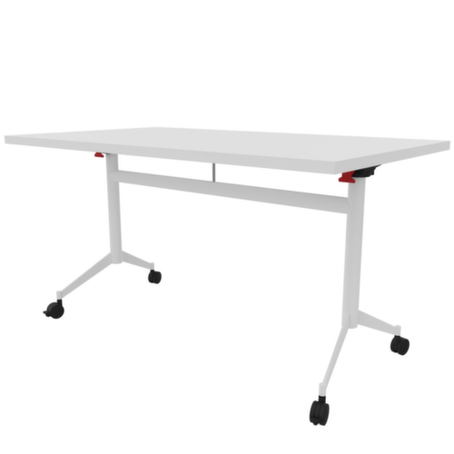 Zum Verstauen bei Nichtgebrauch kann die Tischplatte über die Griffstange um 90° gekippt werden. Plattenform eckig. T-Fußgestell aus Metall mit Epoxidpulverbeschichtung in weiß. Ovalrohr. 4 Rollen unter dem Gestell sorgen für die nötige Mobilität im Arbeitsalltag. Platte aus Holzwerkstoffplatte mit abriebfester und feuchtigkeitsbeständiger Melaminbeschichtung in Dekor weiß. Plattenstärke 30 mm. Alle Kanten sind durch schlagfeste ABS-Umleimer vor unschönen Rissen und Ausbrechen geschützt. Ausgestattet mit Haken- und Verriegelungssystem zur frontalen und seitlichen Verbindung von Tischplatten.