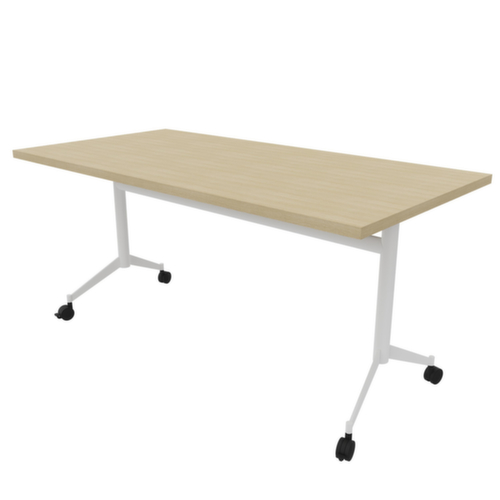 Zum Verstauen bei Nichtgebrauch kann die Tischplatte über die Griffstange um 90° gekippt werden. Plattenform eckig. T-Fußgestell aus Metall mit Epoxidpulverbeschichtung in weiß. Ovalrohr. 4 Rollen unter dem Gestell sorgen für die nötige Mobilität im Arbeitsalltag. Platte aus Holzwerkstoffplatte mit abriebfester und feuchtigkeitsbeständiger Melaminbeschichtung in Dekor Eiche. Plattenstärke 30 mm. Alle Kanten sind durch schlagfeste ABS-Umleimer vor unschönen Rissen und Ausbrechen geschützt. Ausgestattet mit Haken- und Verriegelungssystem zur frontalen und seitlichen Verbindung von Tischplatten.